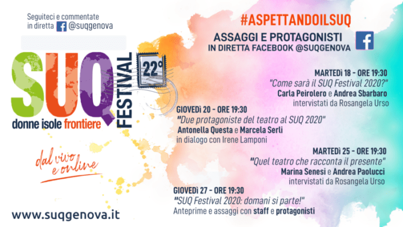 Se siete curiosi e volete conoscere in anteprima come sarà la 22esima edizione del Suq Festival, come prenotare gli spettacoli (quest’anno indispensabile) e quale sarà il programma, basta sintonizzarsi sulla Pagina Facebook del Suq dove in diretta, i protagonisti del Festival risponderemo alle vostre domande e vi daranno alcune anticipazioni e novità. Si inizia martedì 18 settembre alle 19.30 con Carla Peirolero e Andrea Sbarbaro di Cittadini sostenibili che, intervistati da Rosangela Urso, racconteranno questa 23esima edizione con al centro il teatro e l’ambiente.