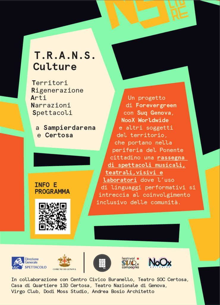 Lo scorso giovedì, al Centro Civico Buranello, è stato presentato il nuovo progetto “Trans Culture – Territori Rigenerazione Arti Narrazioni Spettacolo” dedicato alle arti performative e nato per portare nella periferia del Ponente cittadino una rassegna di spettacoli musicali, teatrali e visivi e laboratori aperti a tutta la cittadinanza. Attivo a Sampierdarena e a Certosa da ottobre fino a metà dicembre, è stato ideato da Forevergreen con Suq Genova e Noox Worldwide ed è vincitore del Bando “Per il sostegno alle attività di spettacolo dal vivo nelle aree periferiche della città di Genova”, nell’ambito dell’Accordo di Programma MIC – Comune capoluogo della città metropolitana di Genova”, promosso dal Comune di Genova e dal Ministero della Cultura.